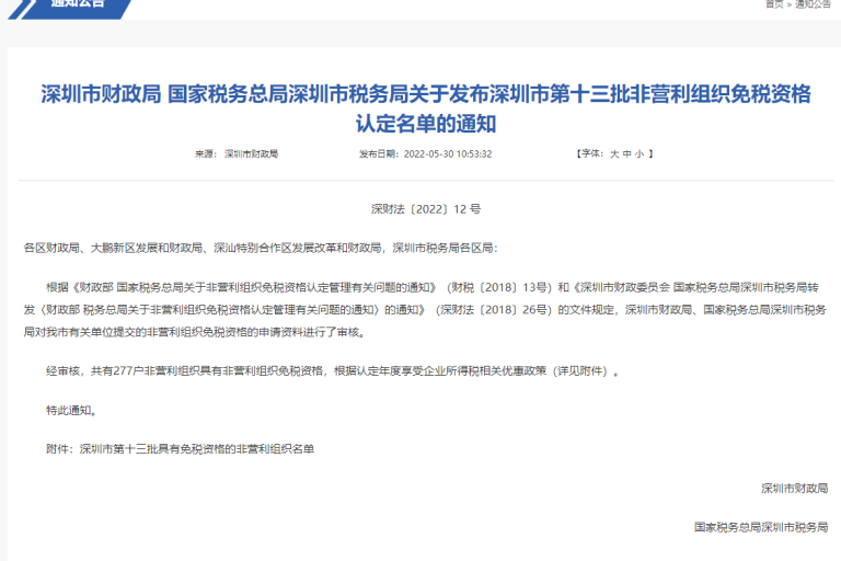 所得税资格 财务信息公开2023年5月23日 深圳市第十三批具有免税资格的非营利组织名单 详见深圳市财政局网站文件《深圳市财政局 国家税务总局深圳市税务局关于发布深圳市第十三批非营利组织免税资格认定名单的通知》